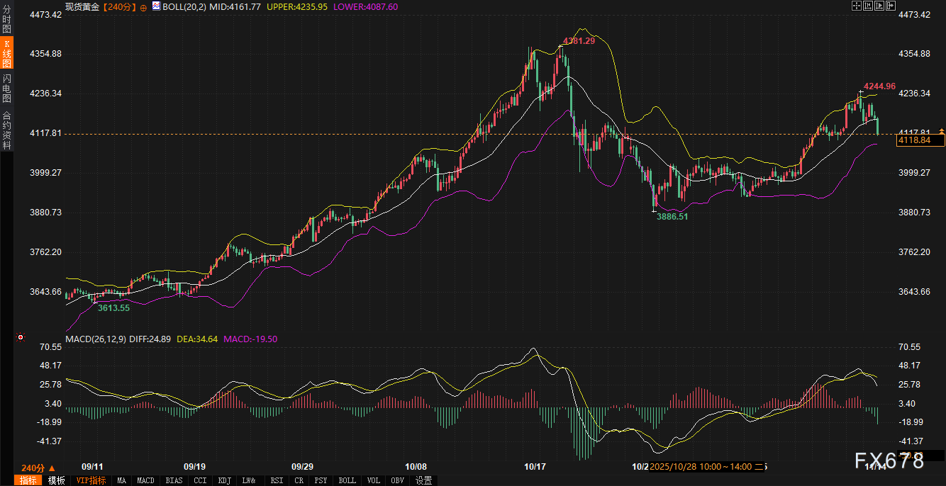 技术面显示,金价跌破布林带中轨,接近下轨,MACD指标暗示下行动能或趋弱。支撑区间在4080-4090美元/盎司,阻力区间在4160-4180美元/盎司。若地缘风险回升,可能逆转当前回调趋势。