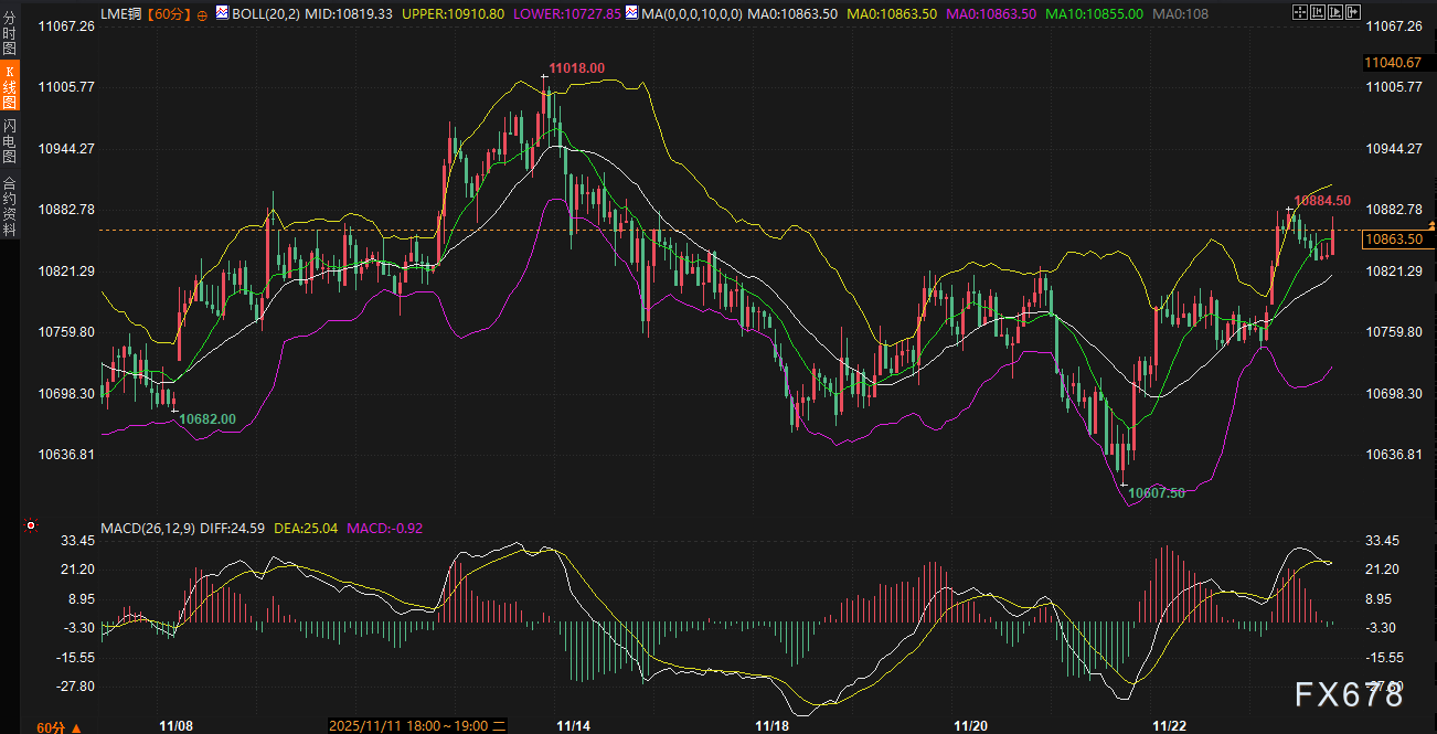 汇通财经APP讯——周二(11月25日),伦敦铜与上海沪铜延续近期反弹态势,双双收涨。伦敦金属交易所(LME)三个月期铜在亚洲交易时段报10861.50美元/吨,日内上涨0.82%;沪铜主力合约收于86590元/吨,单日涨幅0.64%,实现连续两个交易日上行。当前铜价已攀升至近两周高位,市场在多空因素交织中寻找方向。