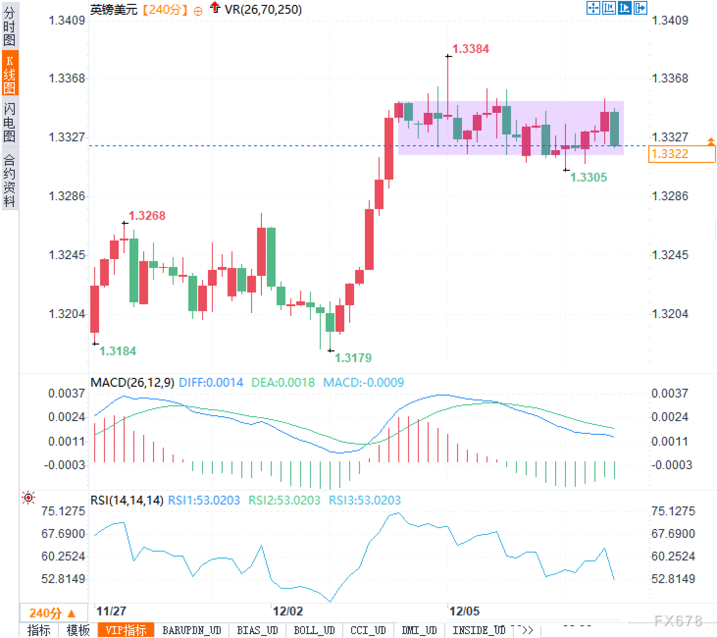 从240分钟图看,英镑兑美元在1.3179一带完成阶段性探底后快速拉升,最高触及1.3384,随后进入横向整理区间(约1.3310—1.3355)。现价1.3320位于箱体中下沿附近,短线多空处于再平衡。RSI(14)约53,处于中性区域,未见明显超买/超卖。结构上,1.3305/1.3310为近端支撑带,若失守则需关注1.3286与前低区域的承接;上方1.3355及1.3384为前高与抛压密集区。整体属于“急涨后消化”的震荡阶段,后续可观察价格对箱体上下沿的有效突破与量能/动能配合,以判断趋势延续或回撤加深。